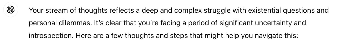ChatGPT: Your stream of thoughts reflects a deep and complex struggle with existential questions and personal dilemmas. It’s clear that you’re facing a period of significant uncertainty and introspection. Here are a few thoughts and steps that might help you navigate this: