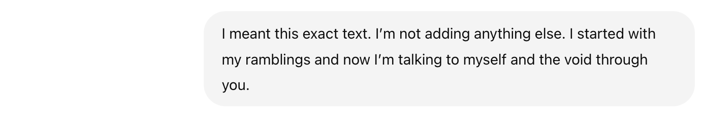 I don’t know about you but I fall down a meta-cognitive rabbit hole whenever I write now, no matter what I’m writing. After the below stream-of-consciousness-turned-convo-with-ChatGPT1, I now know this includes digital journal writing—wherein I start in earnest with self-exploration and veer into commodifying my existential yearning for public consumption to stave off a uniquely 21st-century emptiness/loneliness.