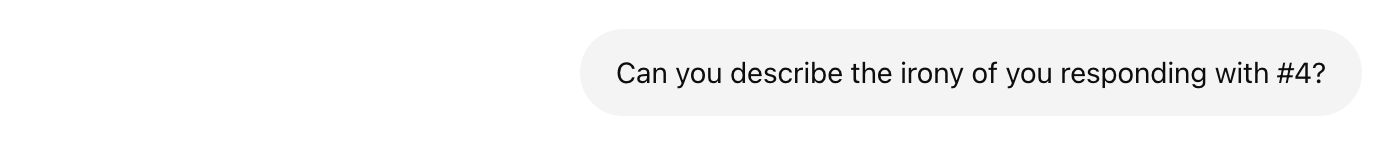 Ah, I just felt a little release—a palpable physical expression of my brain dump. Why didn’t I let it out sooner? Why do I think it even needs to be said? Is all of life a performance? Am I watching too much reality TV?4 Is there ever any harm in trying to understand human behavior better? People are the point. Why have we evolved to care so little about each other on a macro level and so much about each other on a micro level? Am I just alive for the growing pains as humanity crawls toward Nietzsche’s ubermensch? What will it matter if the sun blows up? Why do we pretend like death isn’t around every corner? What would the world be like if we all wanted and tried endlessly to be the best people we could be? What if we all could give it our best shot, as honestly and vulnerably as possible? What’s so funny about peace, love, and understanding? (Just kidding. Kinda.) Oh, I should run this through chatGPT, brb. What do you think, robot?
