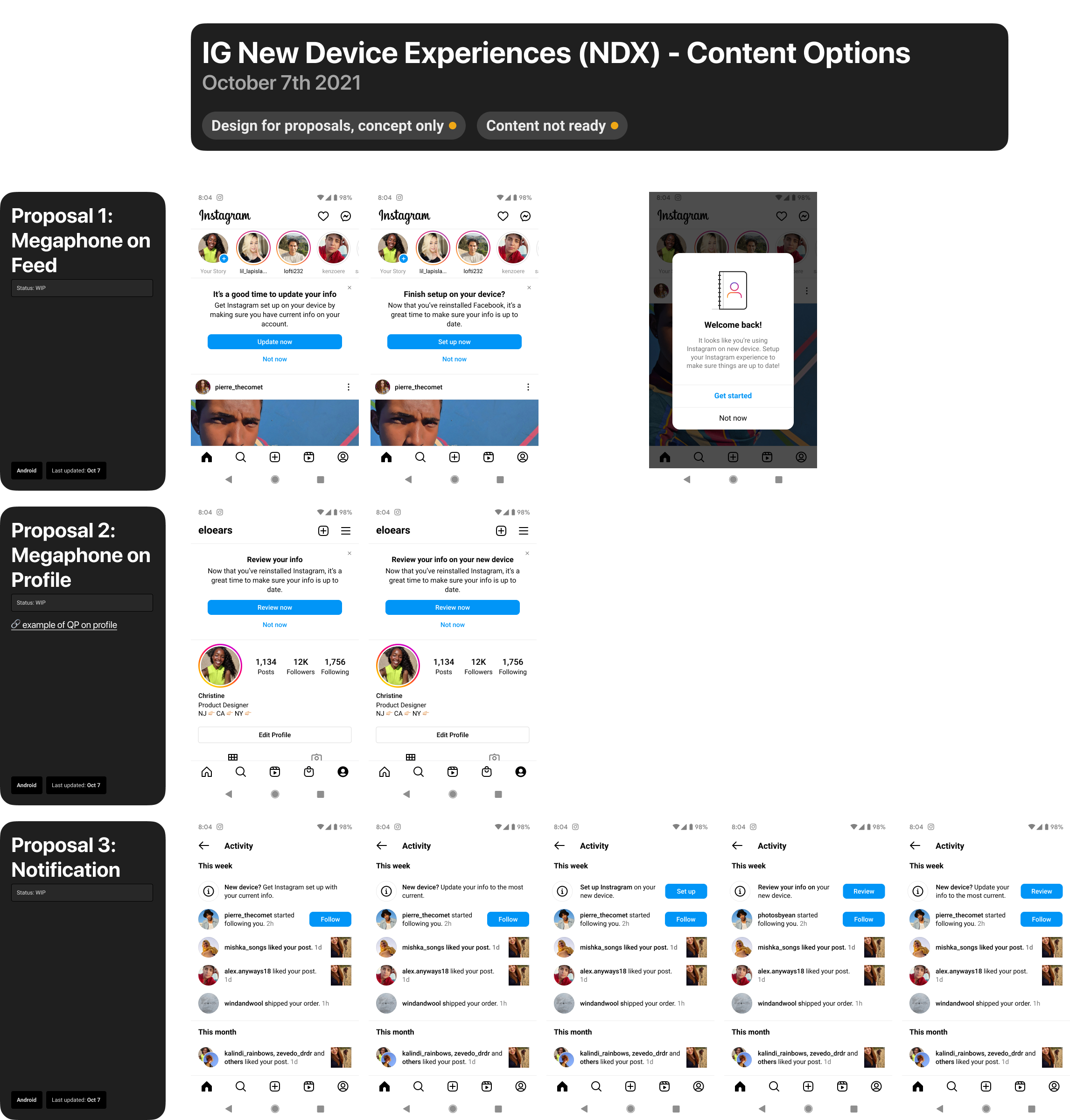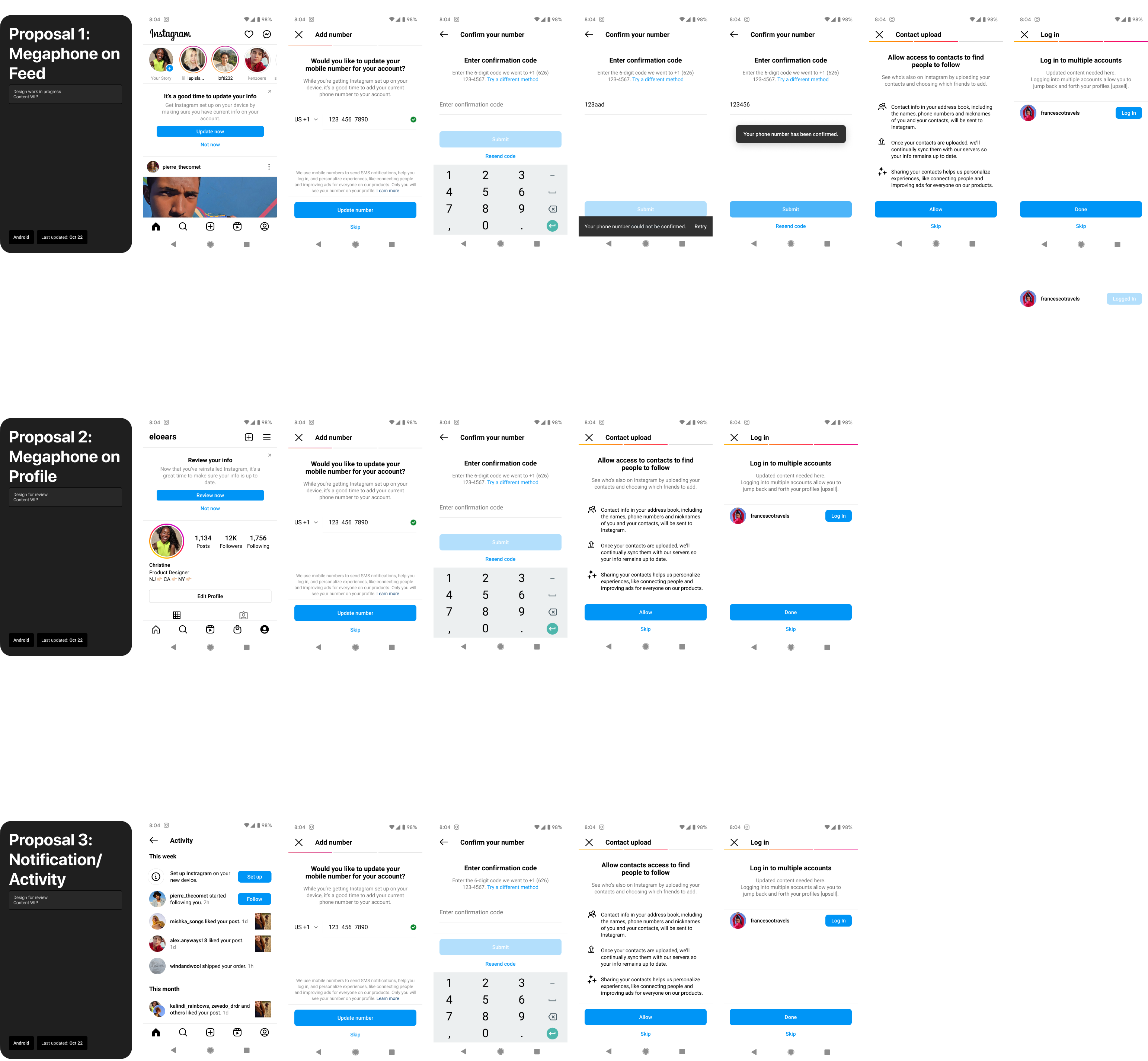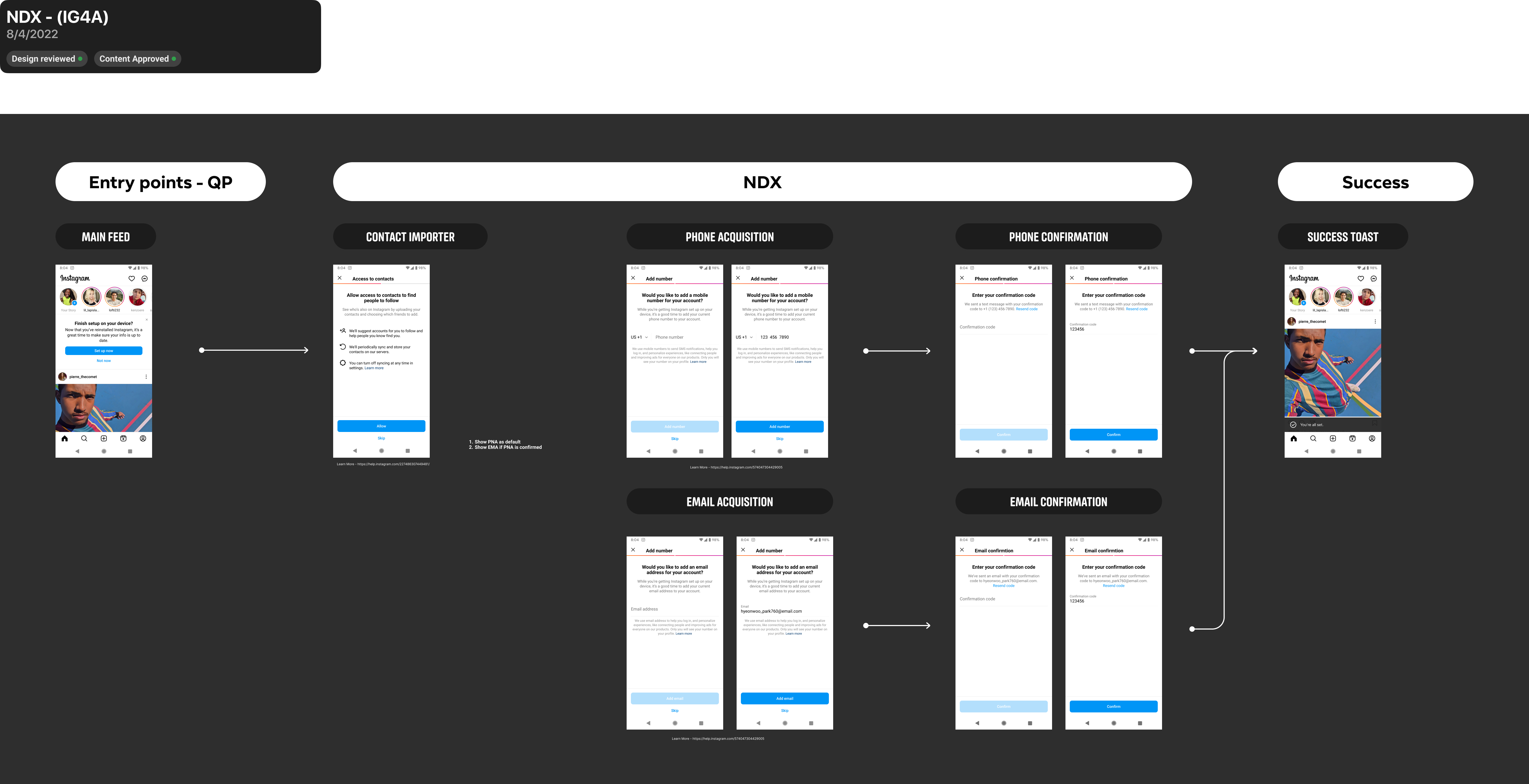 I worked with my engineering team to launch and scale a “New Device Experience (NDX)” across Facebook and, later, Instagram. The flow was served up when a user switched devices, and we used it as a way to increase acquisition of contact points and contact uploading, help the user keep their info up to date, and ensure parity across a user’s linked Meta profiles. I initiated content and design testing to enhance the experience and results over time, and expand the most successful flows to Instagram.