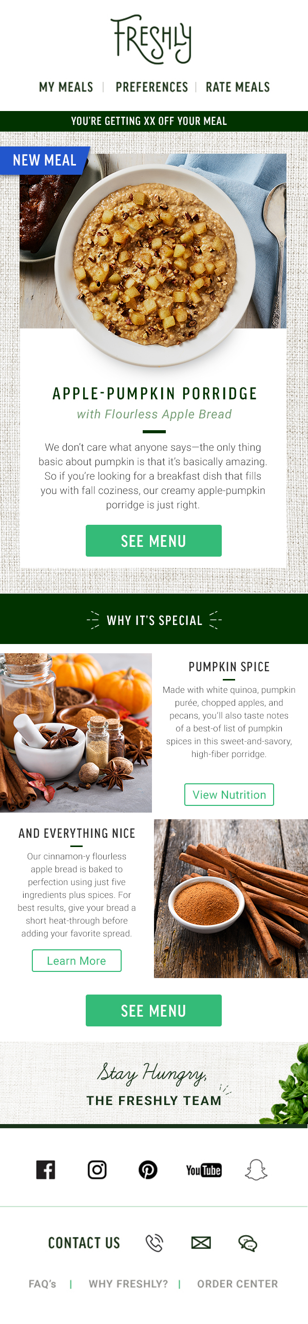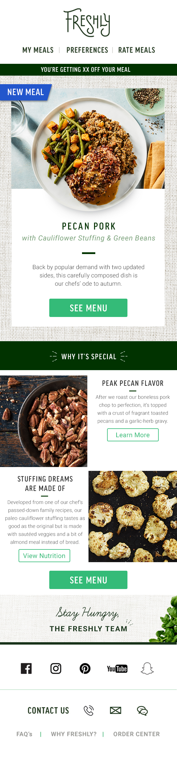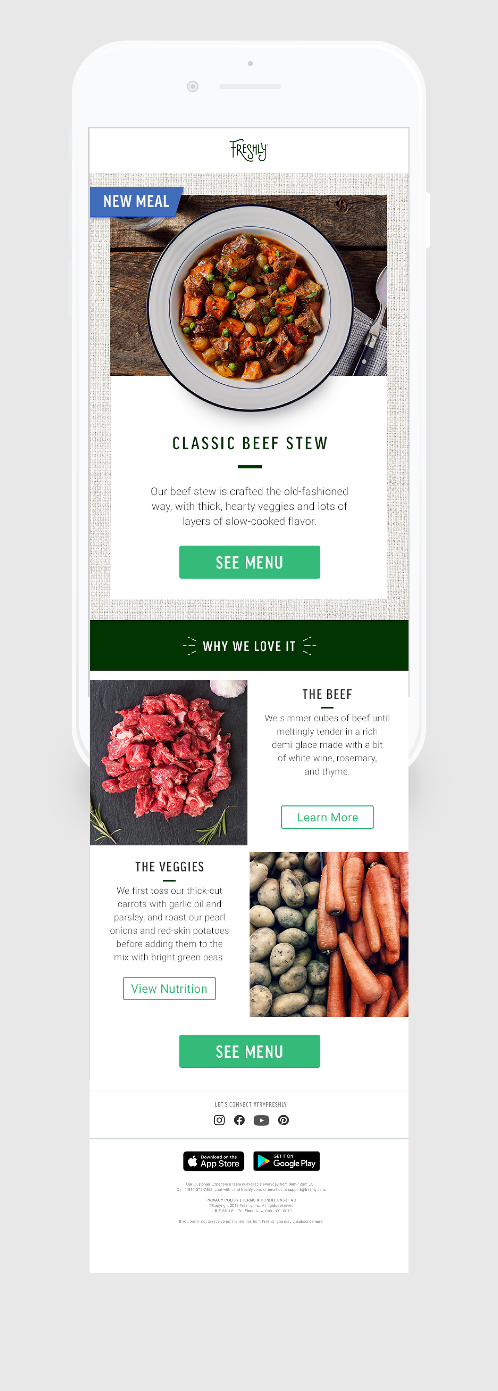 After joining Freshly in summer of 2017, I worked with our email designers, Javier de Guzman and Nina Caldas, to evolve the design of our emails to accommodate more content, updated photography, and campaign integration.