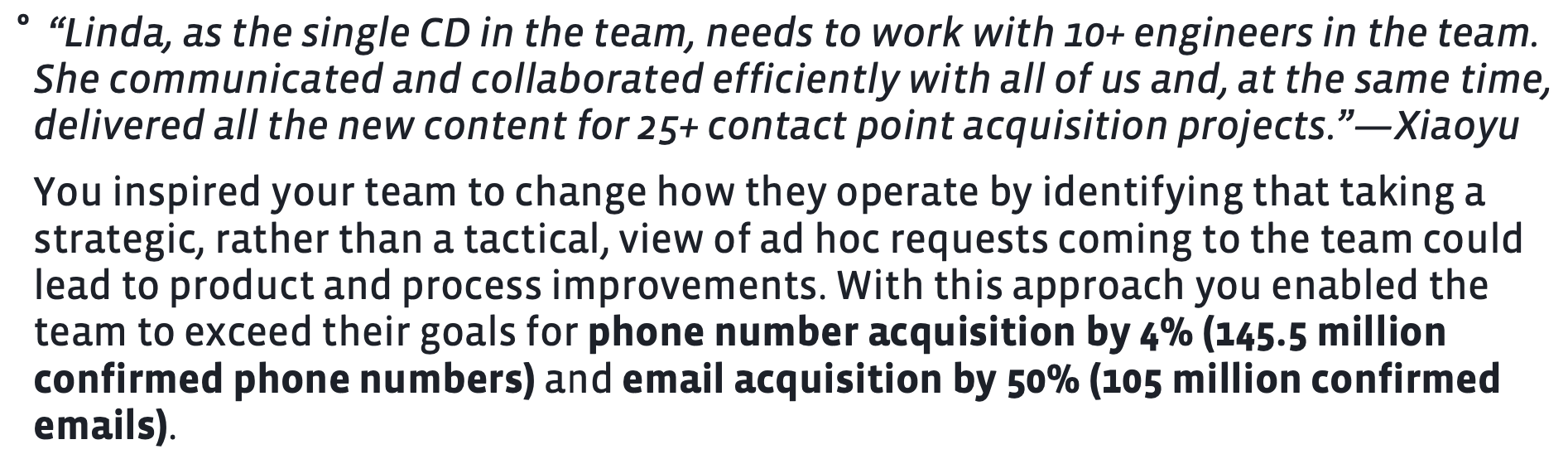 I owned the content design for user experiences around contact points (outside of those used only for security purposes), and optimizing acquisition and management flows across the family of apps. These experiences were closely tied to increased revenue, legal and privacy regulation, user account access across Meta, and innovation around device and profile signals, all requiring a deep product knowledge and understanding of data storage, machine learning models, and government regulations.