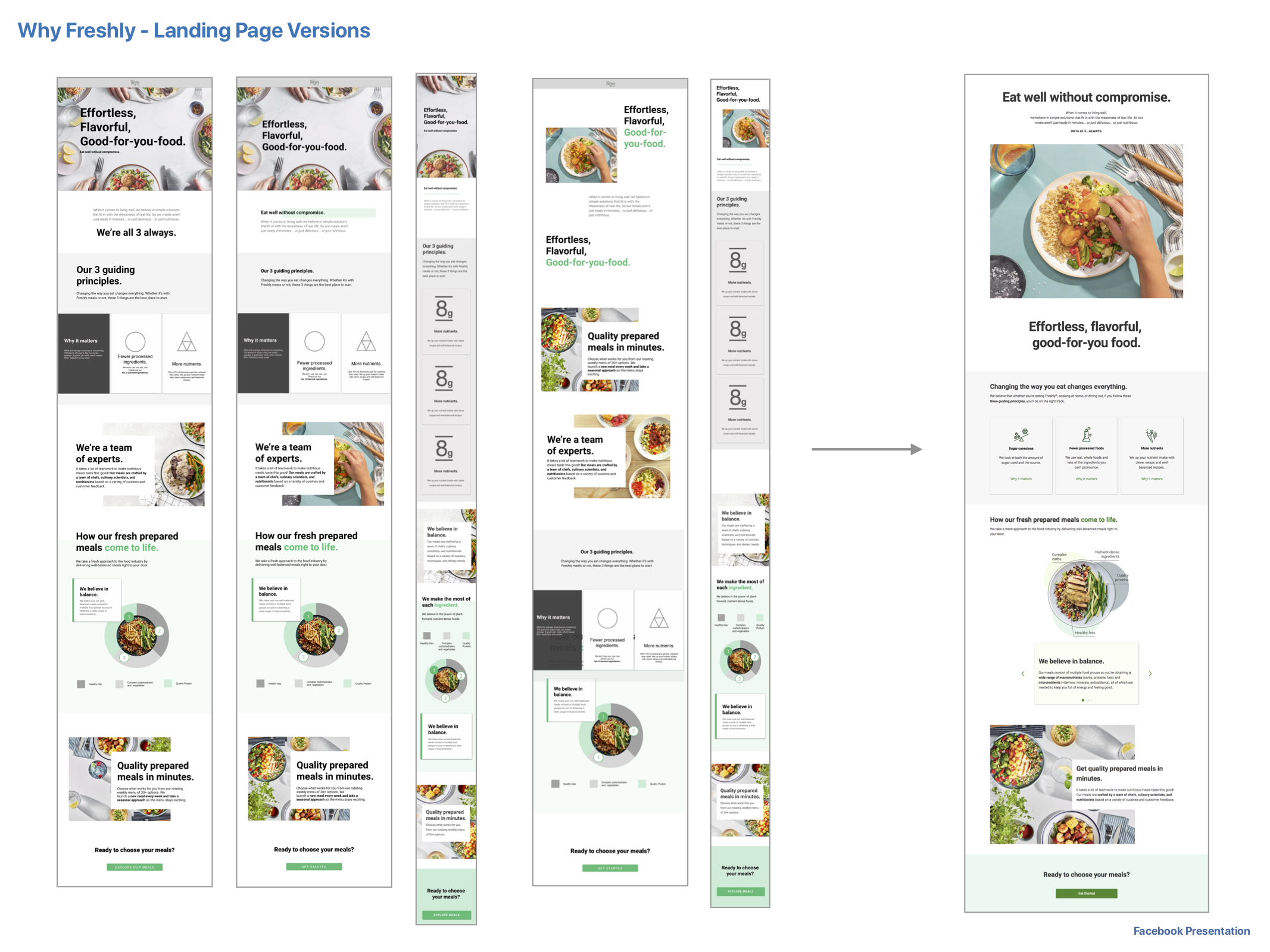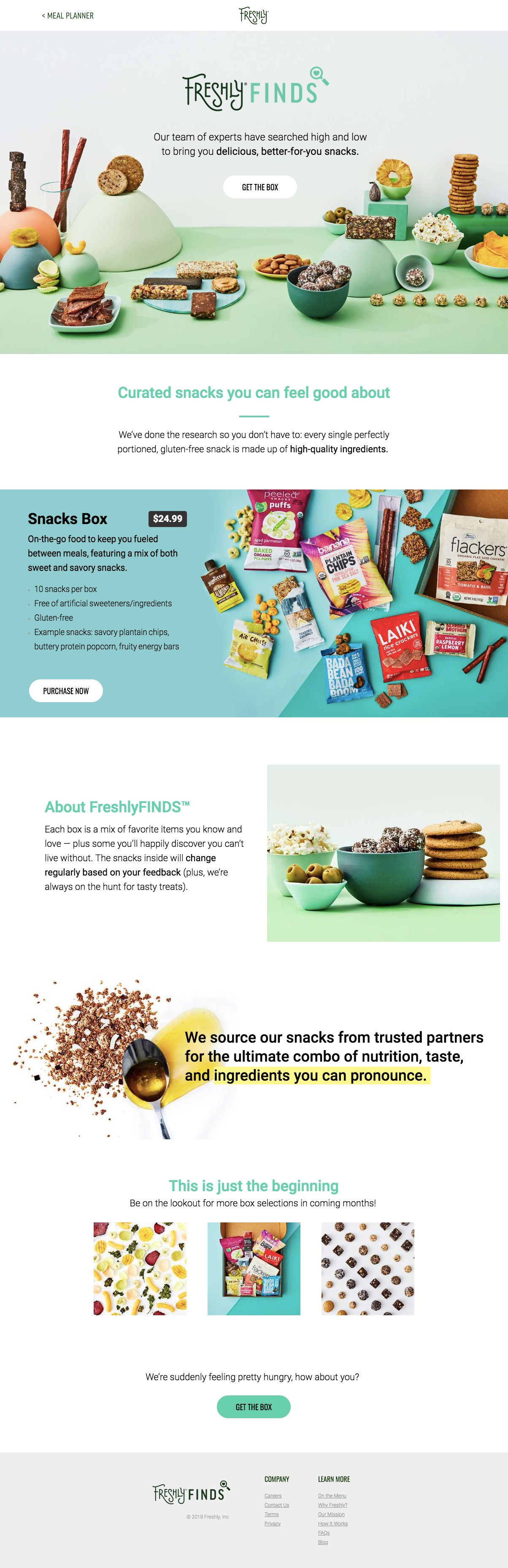 I worked with our product managers and product designers to develop product copy for our website and apps (as well as product copy for our actual food!). We used acquisition landing pages to drive traffic to the website as well as promotional landing pages to highlight value props and new offerings (like snacks).