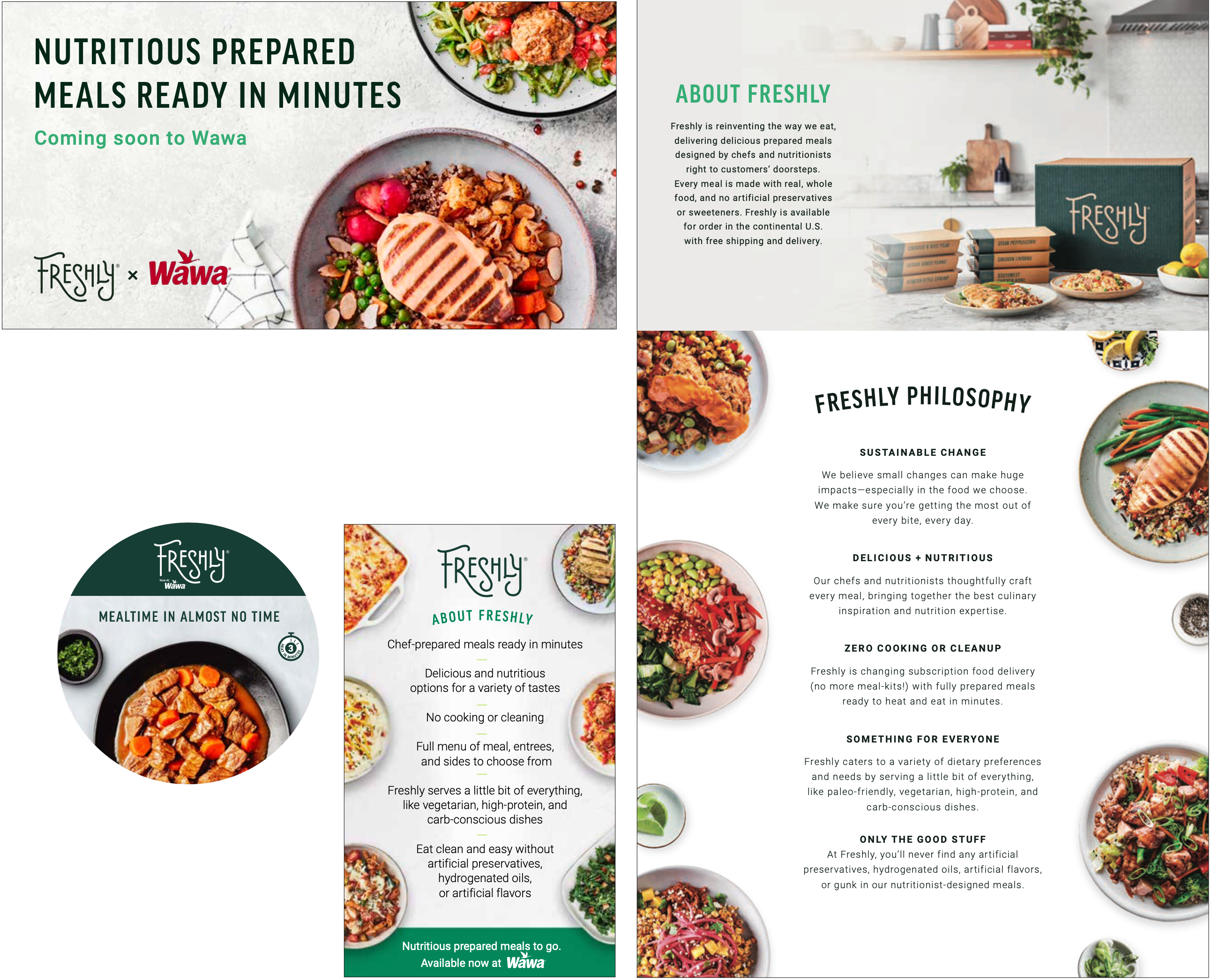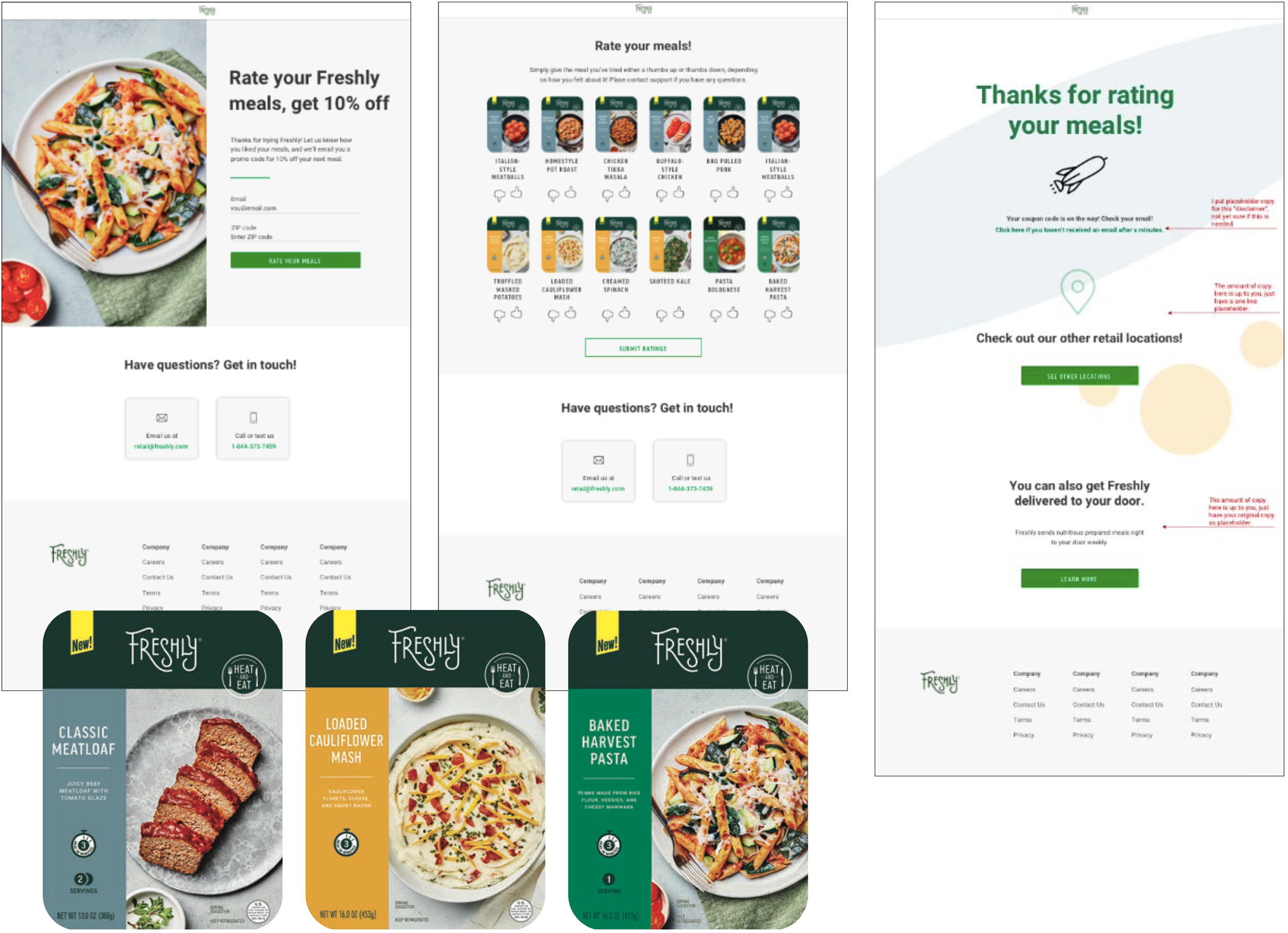 To get ready for Freshly’s first retail launch in WaWa, Janie Javier (designer) and I worked to craft a retail portfolio that displayed our meal offerings, new packaging to accommodate this grab-and-go use case, digital and print marketing assets, and a landing page survey that allowed consumers to rate their meals and order more meals directly through Freshly’s website.