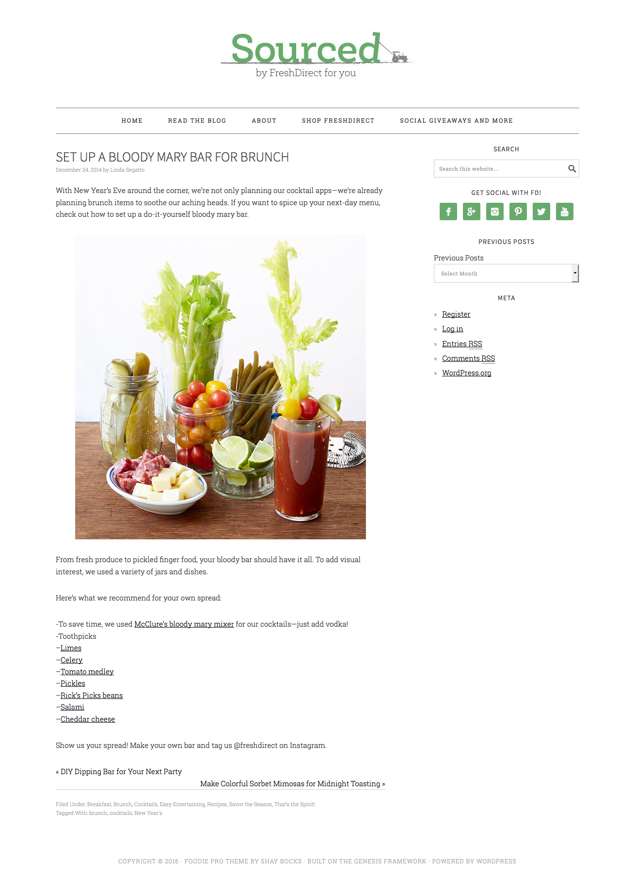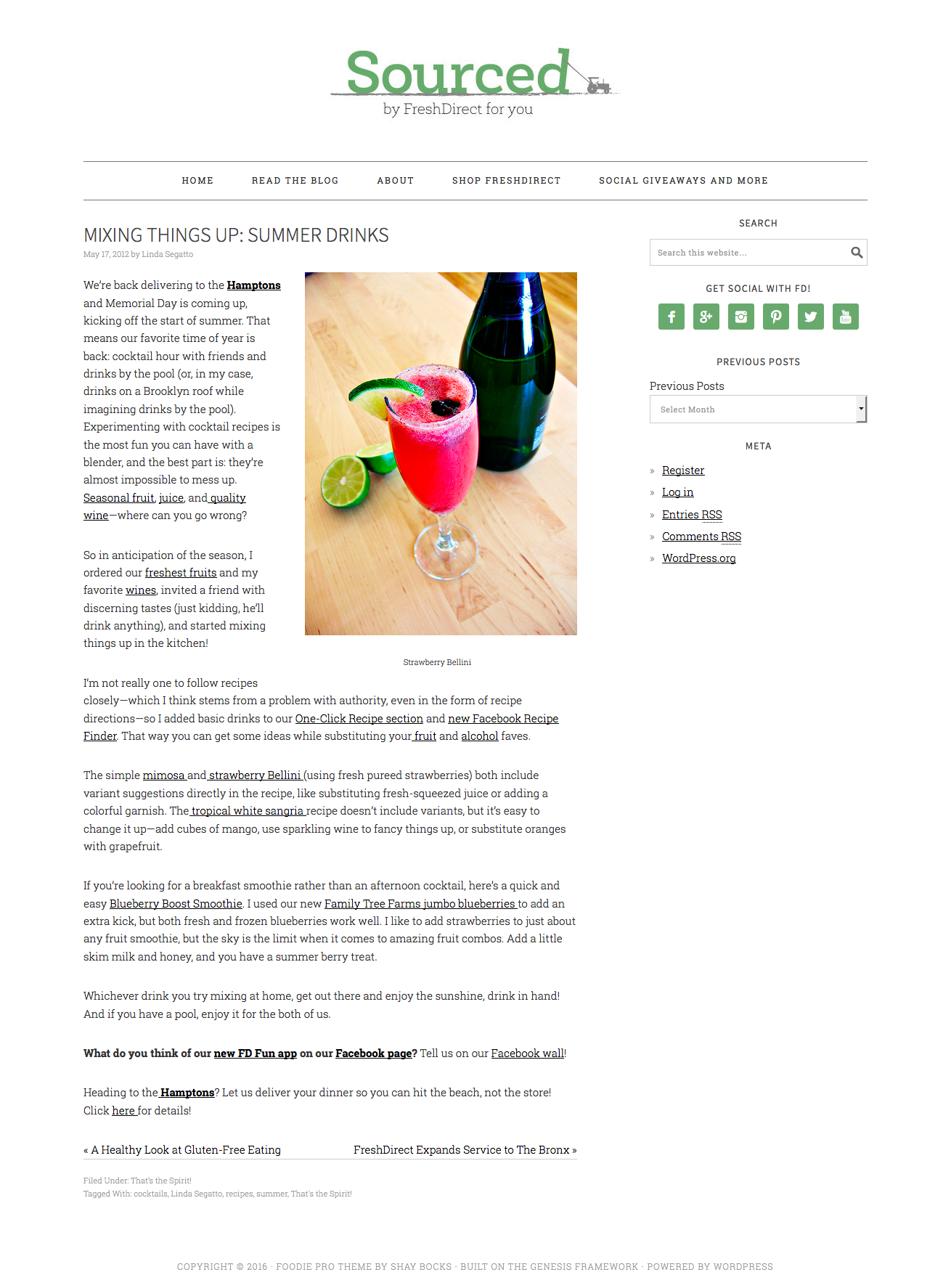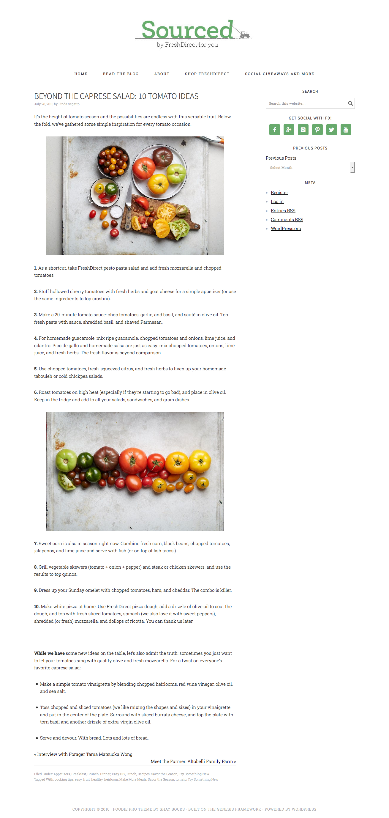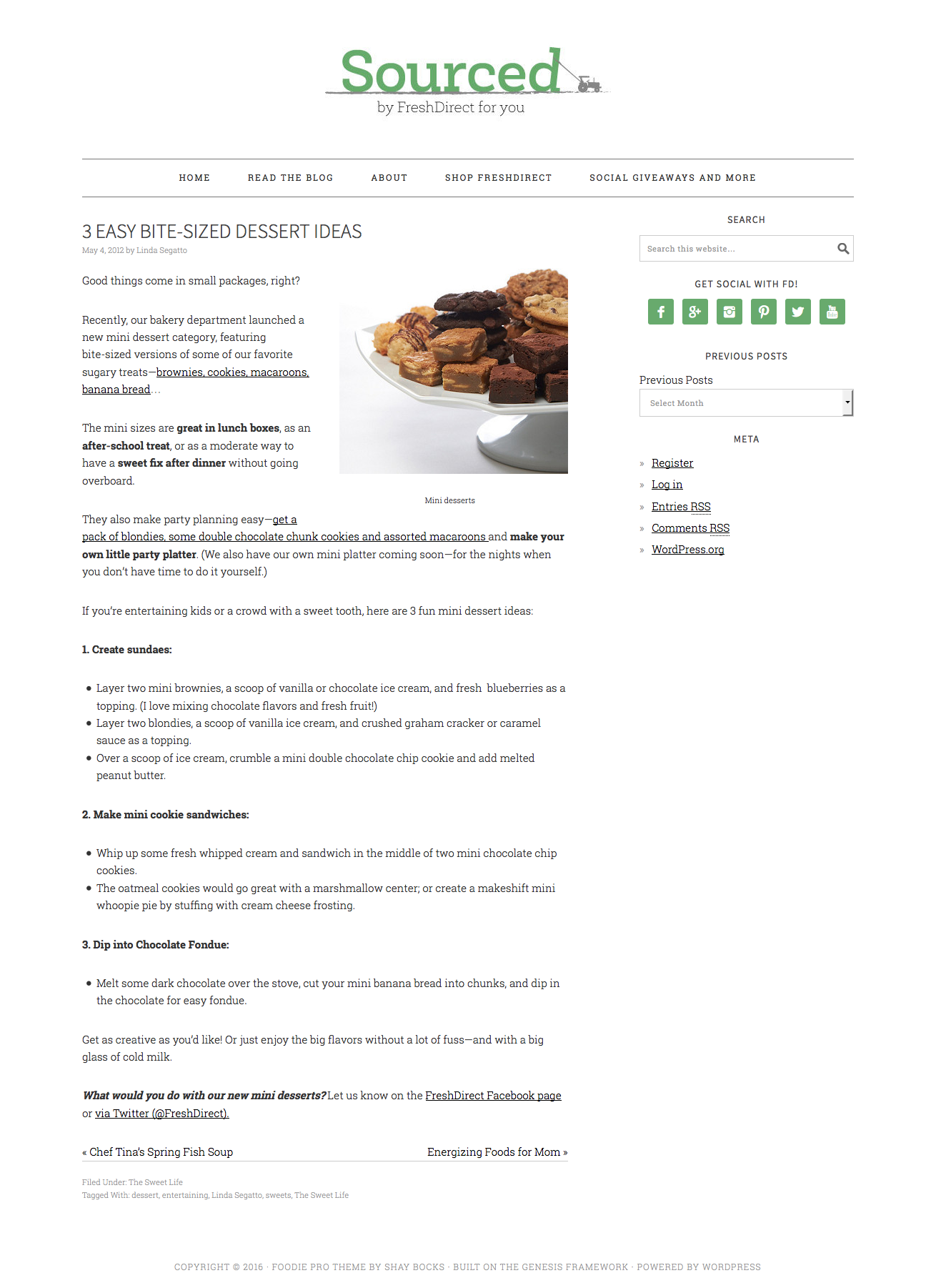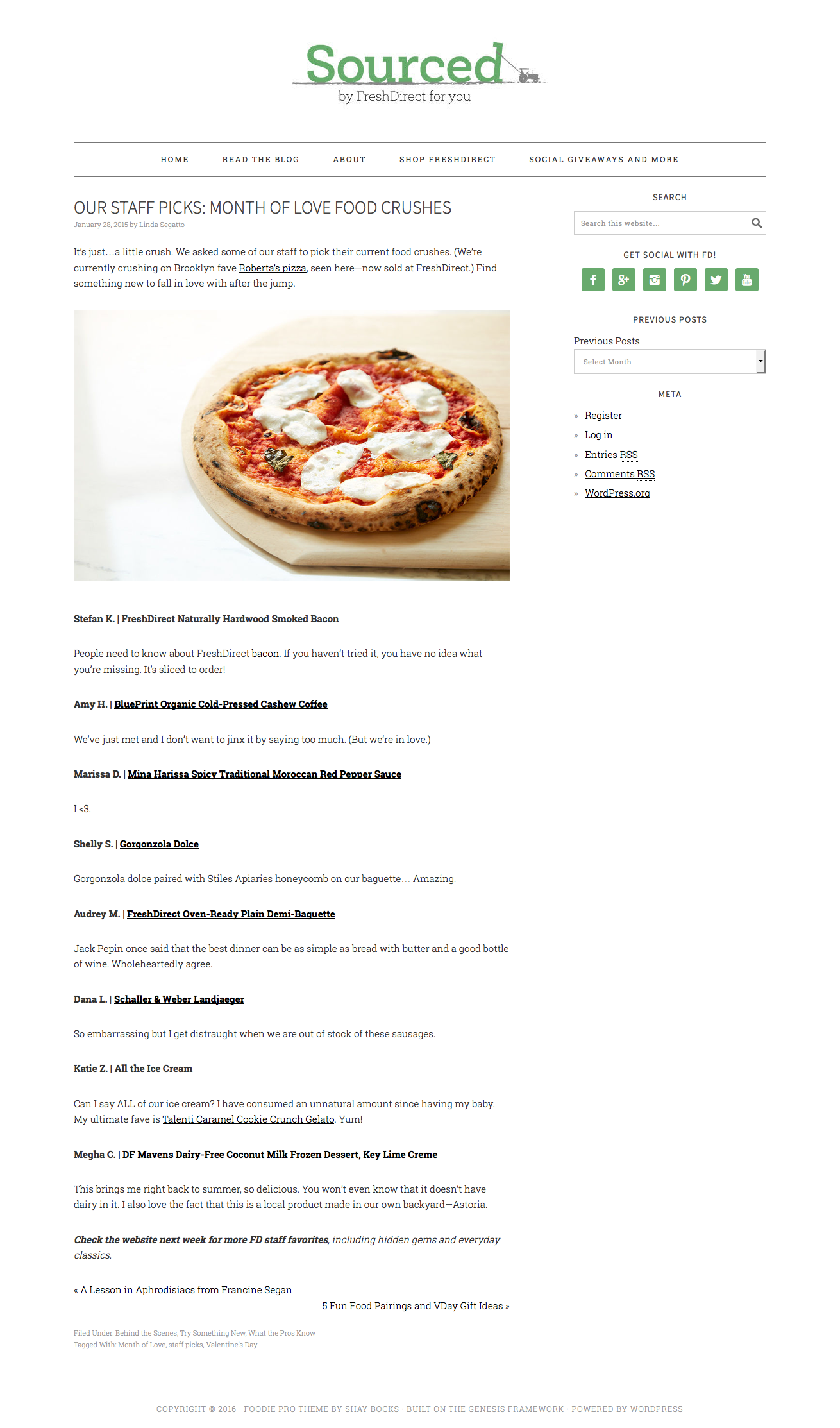 I named, helped design, and managed the blog and its integration and success in FreshDirect marketing by developing a content calendar with our photographers, social media manager, copywriter, and interns to coincide with promotions and tent poles. My authored blog content covered everything from highlighted promotions and integrated partnership content to tips, inspiration, and producer stories. (It’s still named Sourced 10 years later btw.)