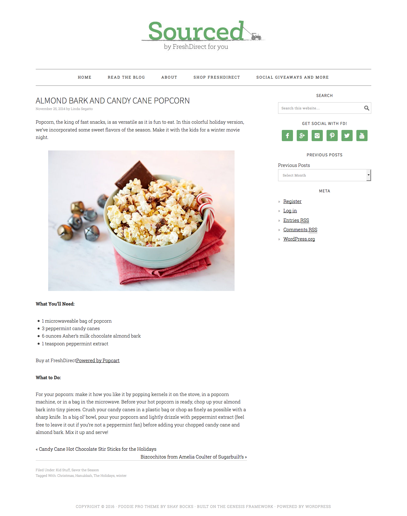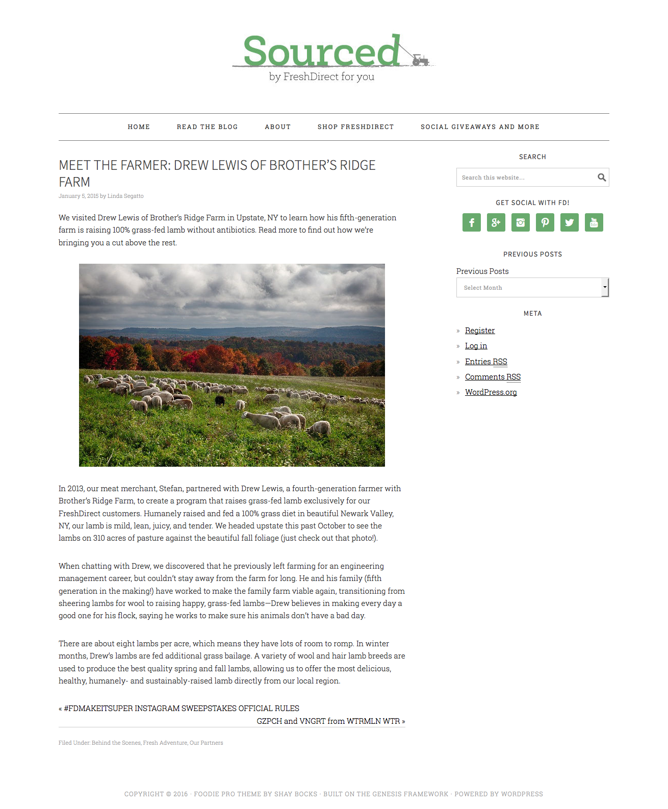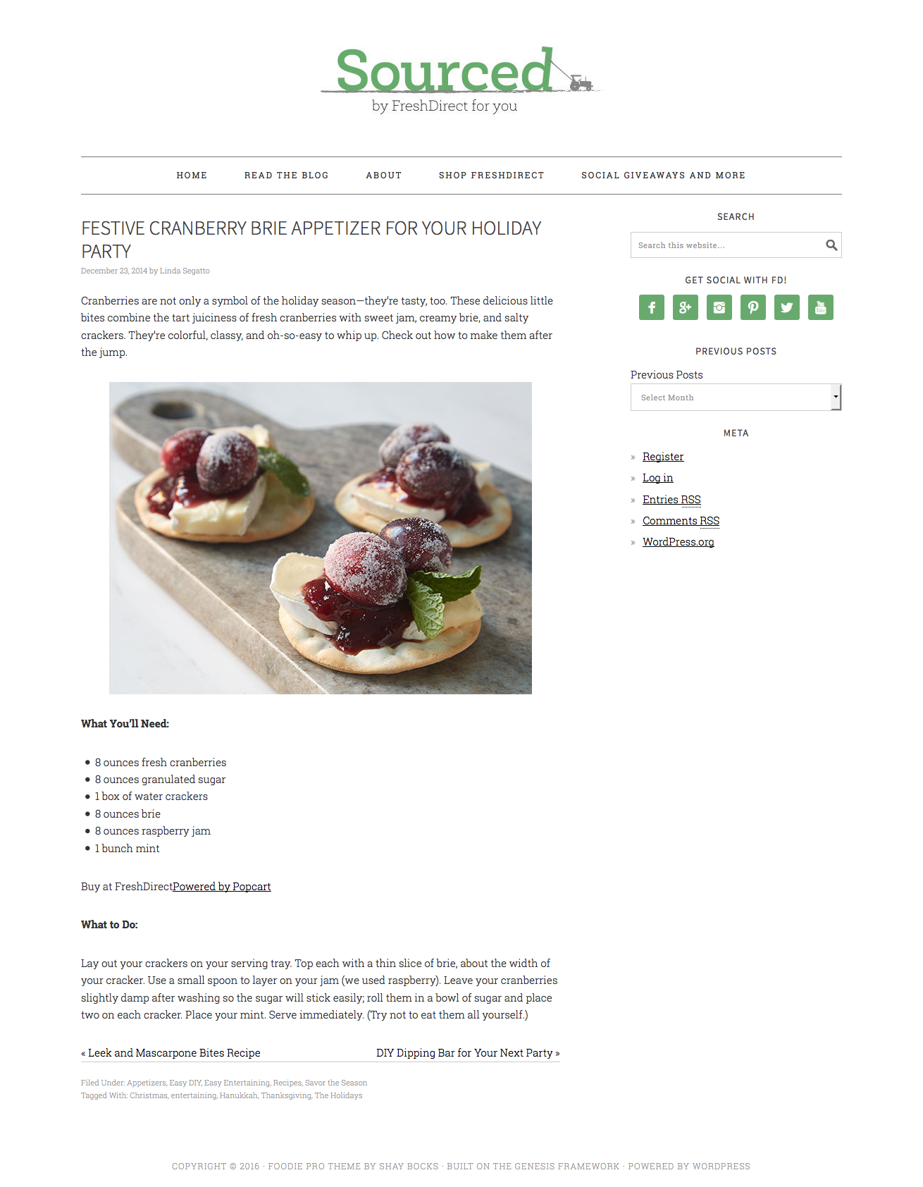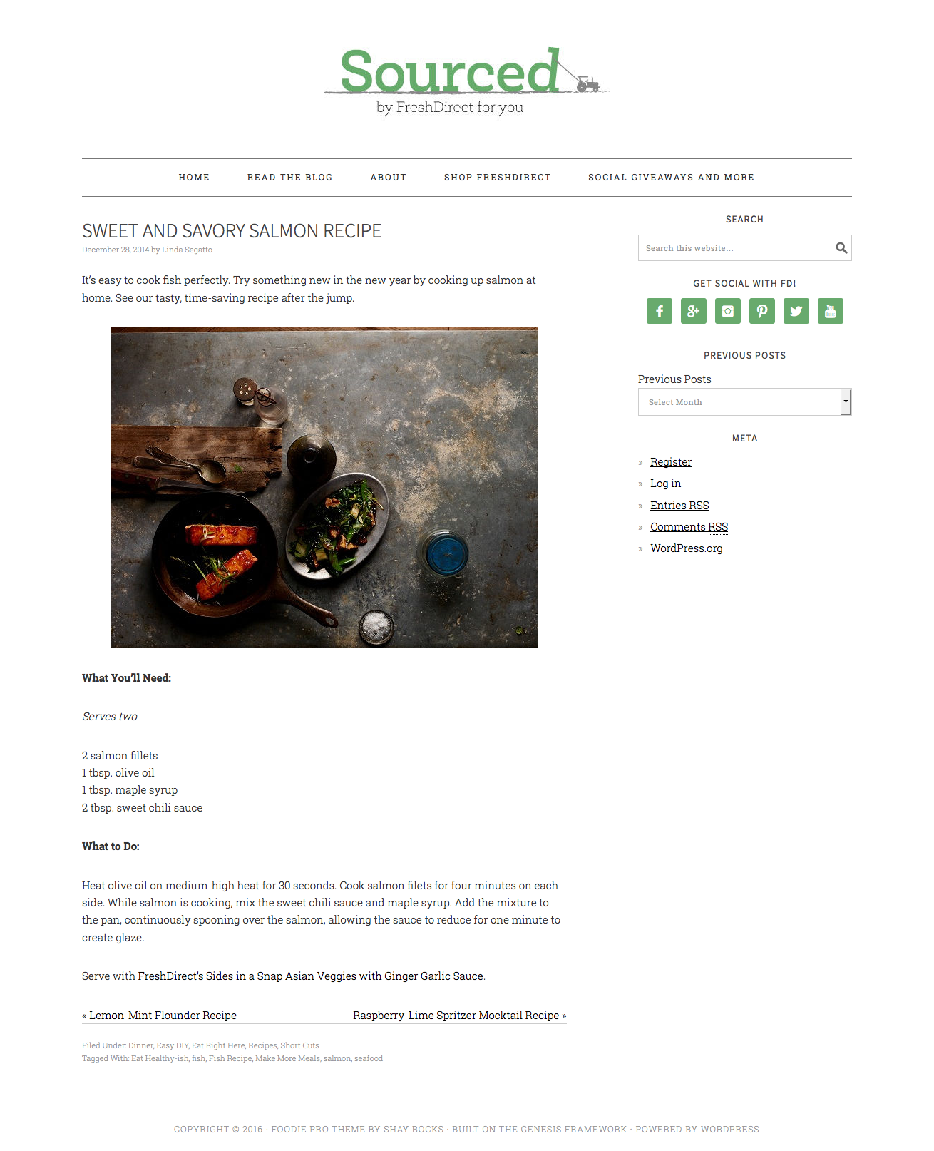 I named, helped design, and managed the blog and its integration and success in FreshDirect marketing by developing a content calendar with our photographers, social media manager, copywriter, and interns to coincide with promotions and tent poles. My authored blog content covered everything from highlighted promotions and integrated partnership content to tips, inspiration, and producer stories. (It’s still named Sourced 10 years later btw.)