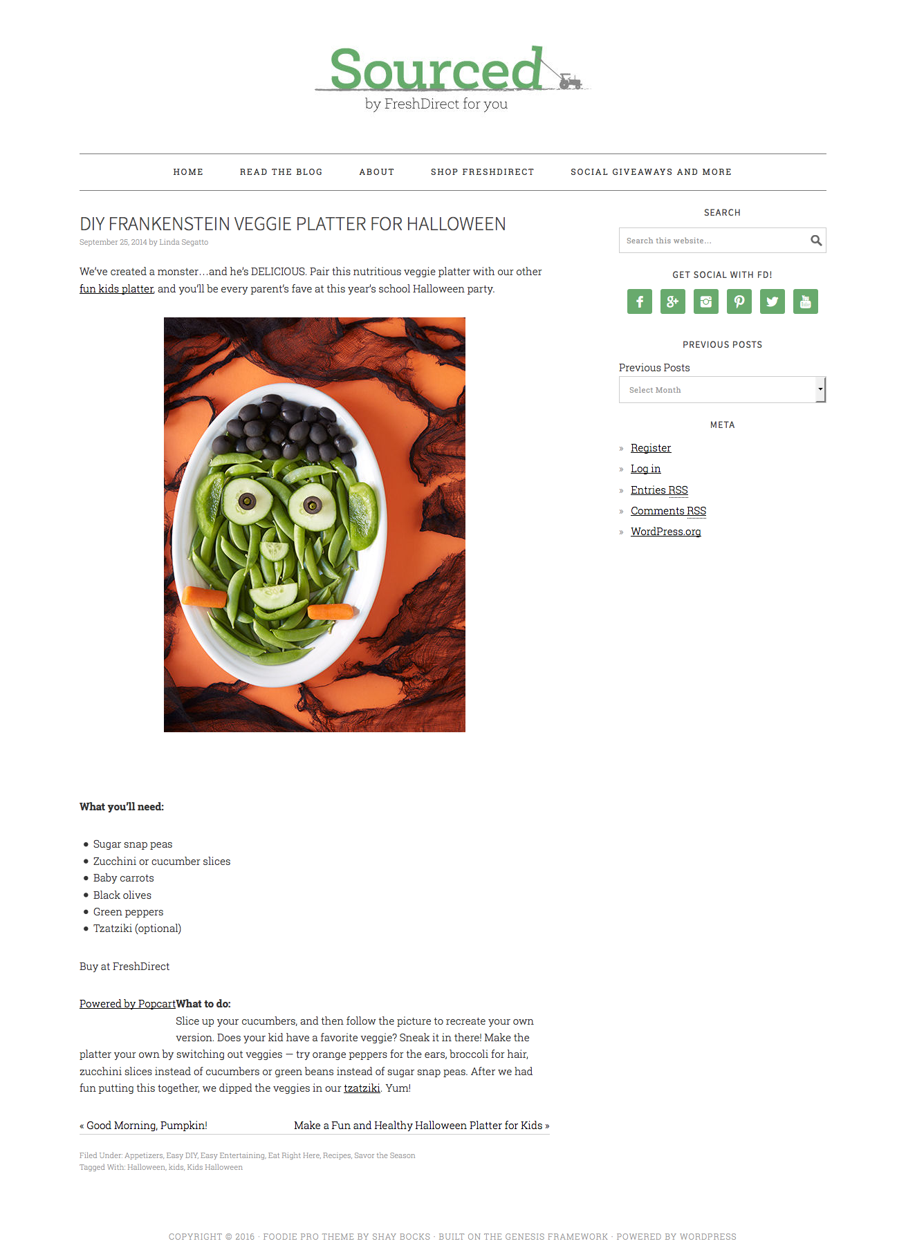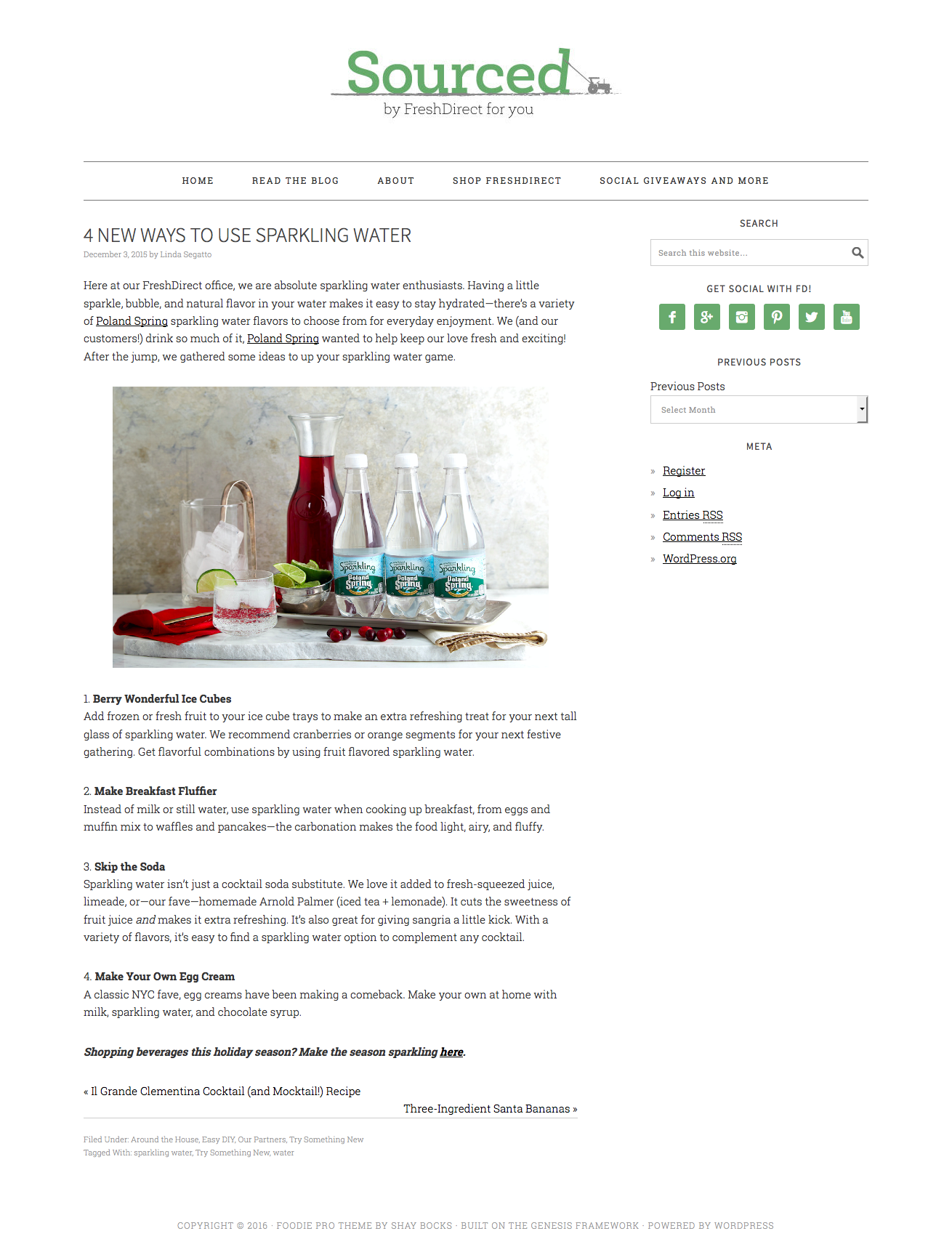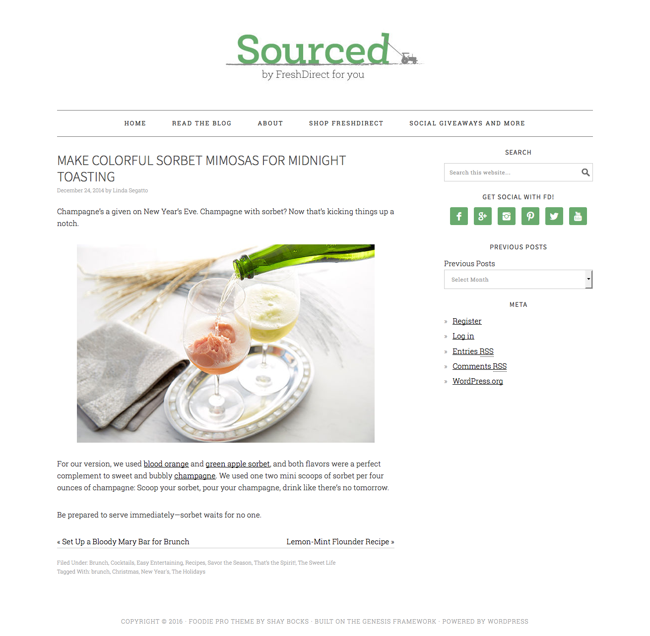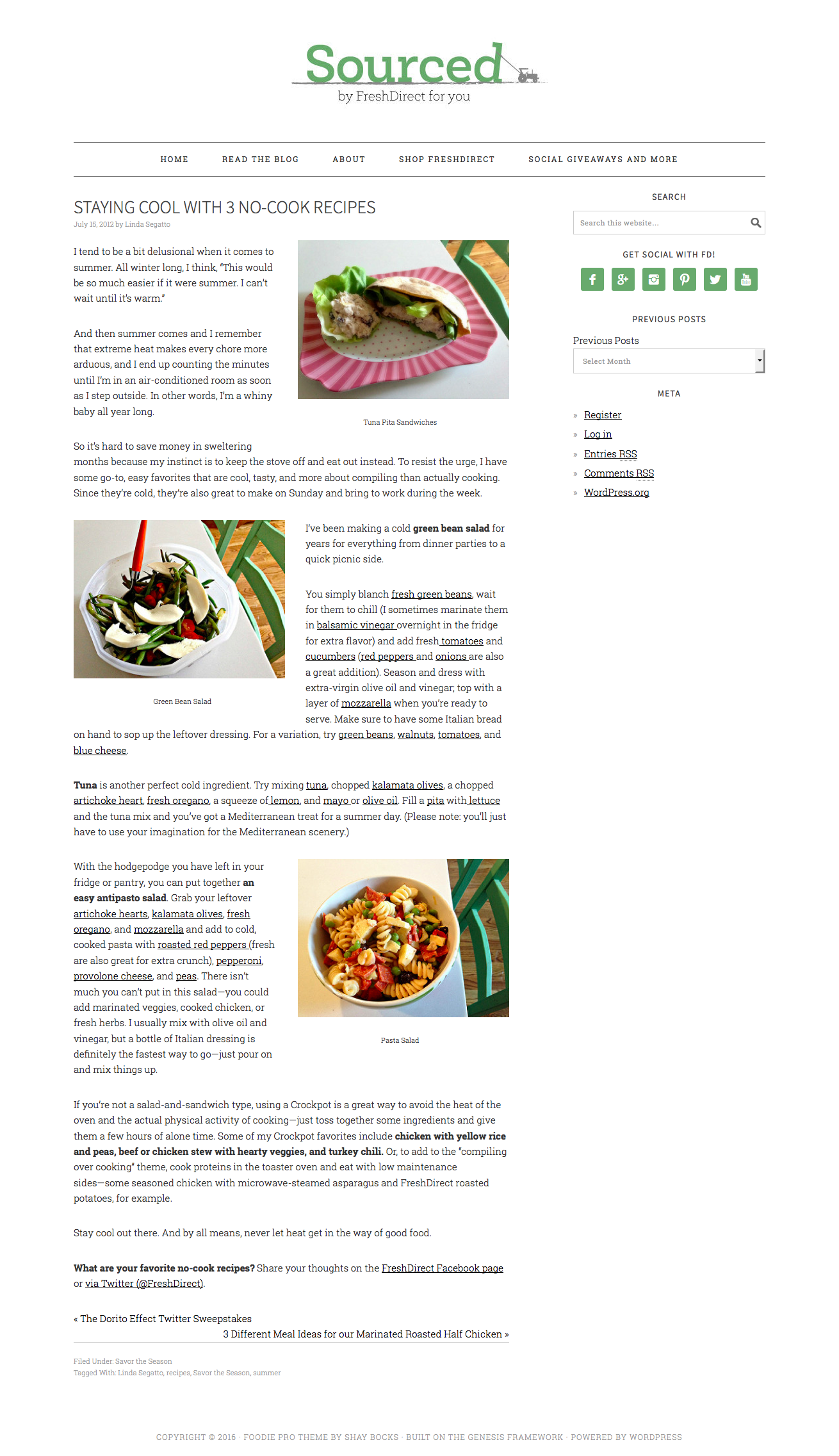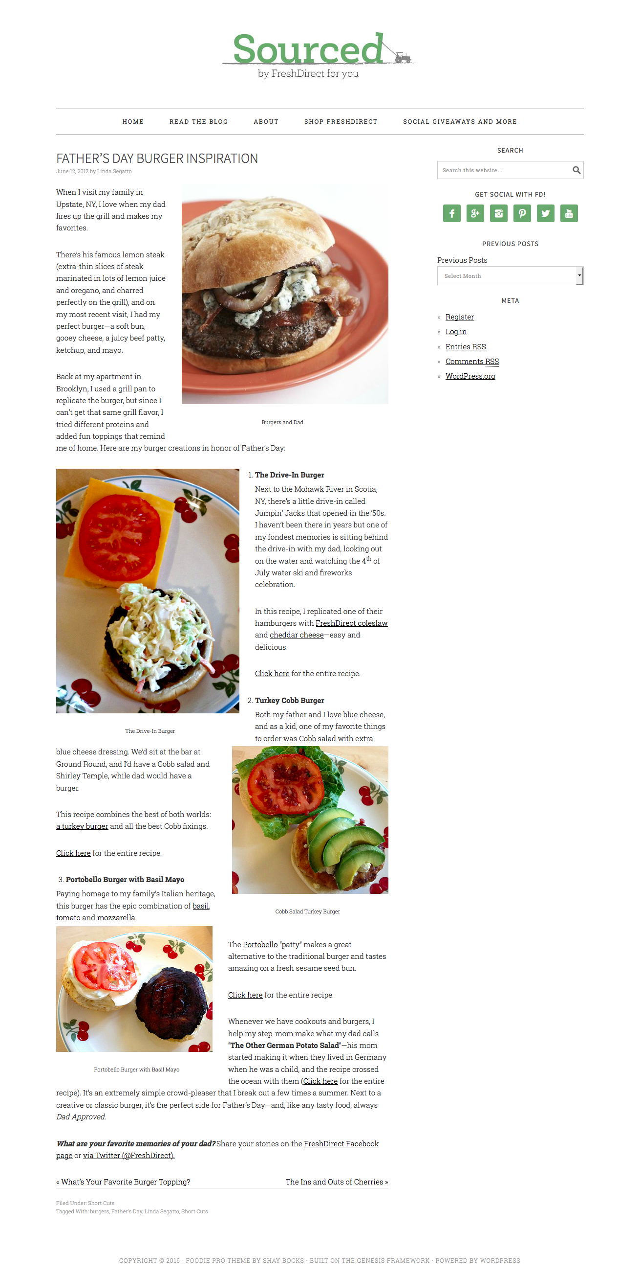 I named, helped design, and managed the blog and its integration and success in FreshDirect marketing by developing a content calendar with our photographers, social media manager, copywriter, and interns to coincide with promotions and tent poles. My authored blog content covered everything from highlighted promotions and integrated partnership content to tips, inspiration, and producer stories. (It’s still named Sourced 10 years later btw.)