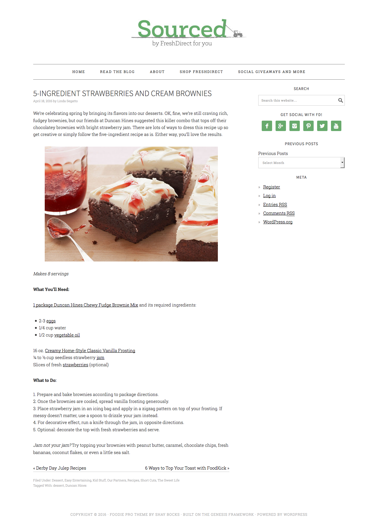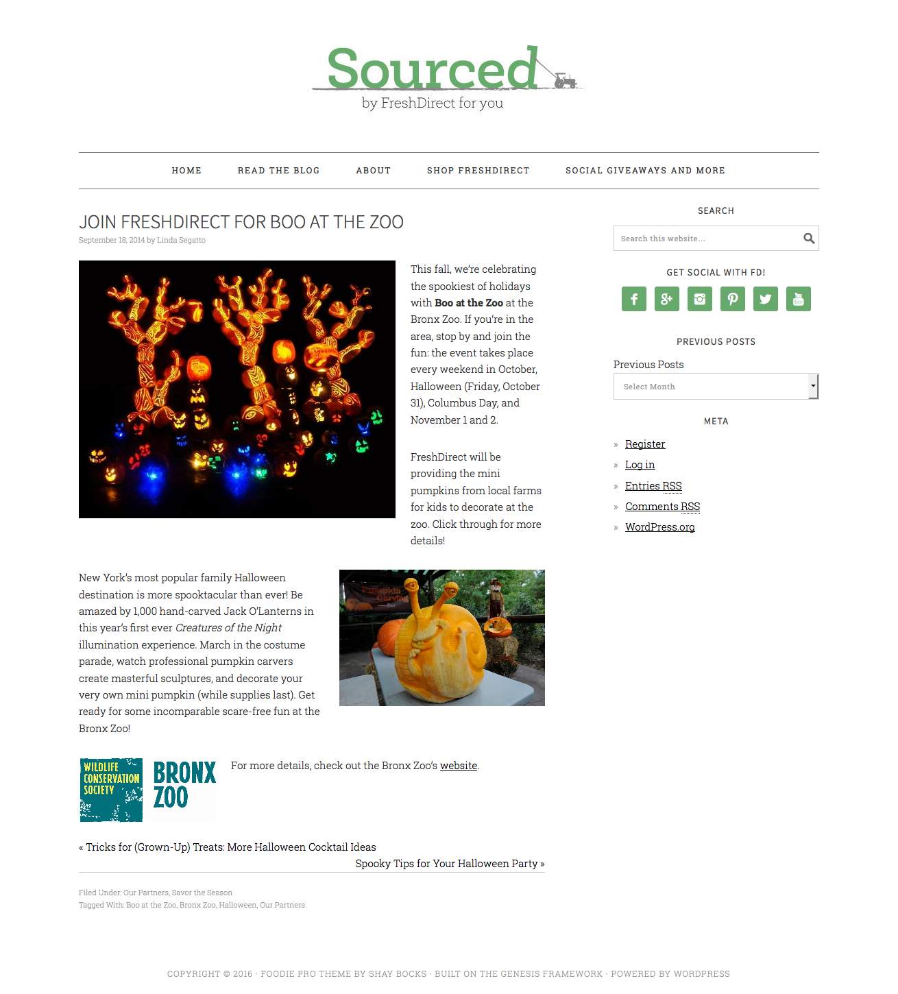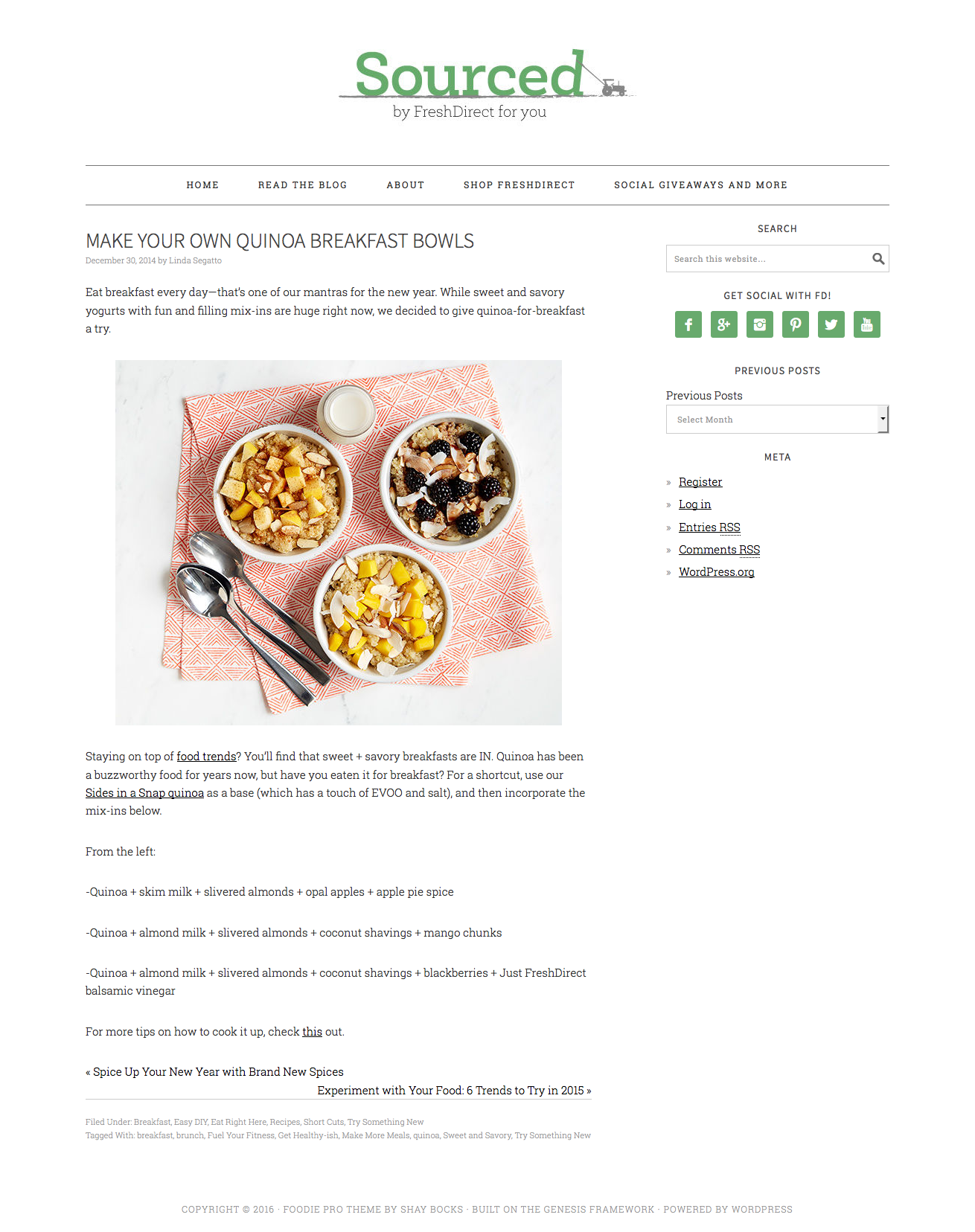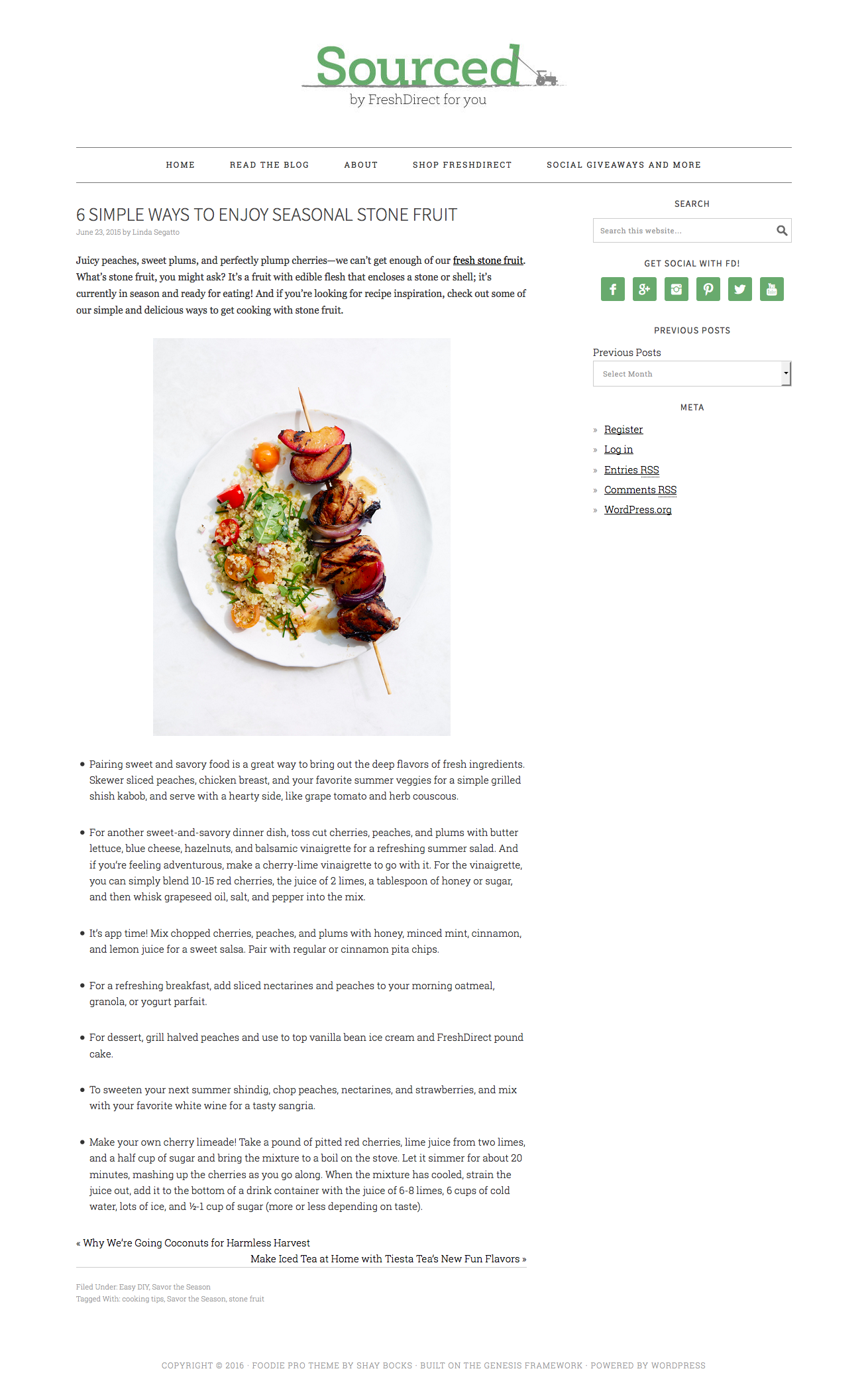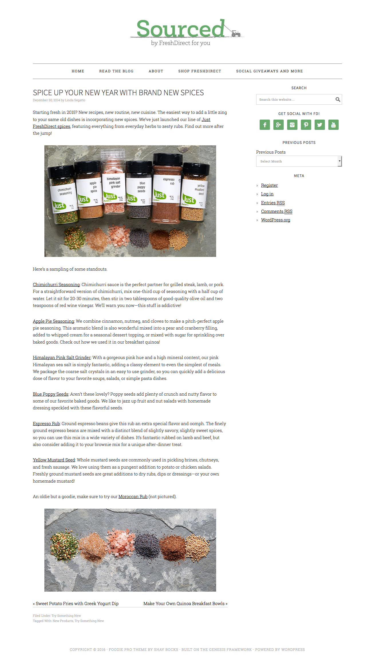 I named, helped design, and managed the blog and its integration and success in FreshDirect marketing by developing a content calendar with our photographers, social media manager, copywriter, and interns to coincide with promotions and tent poles. My authored blog content covered everything from highlighted promotions and integrated partnership content to tips, inspiration, and producer stories. (It’s still named Sourced 10 years later btw.)