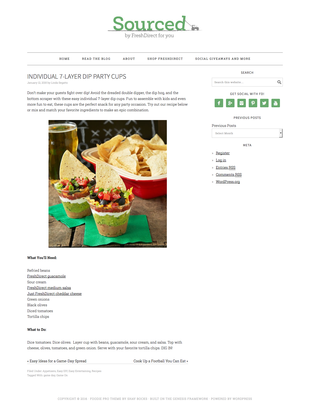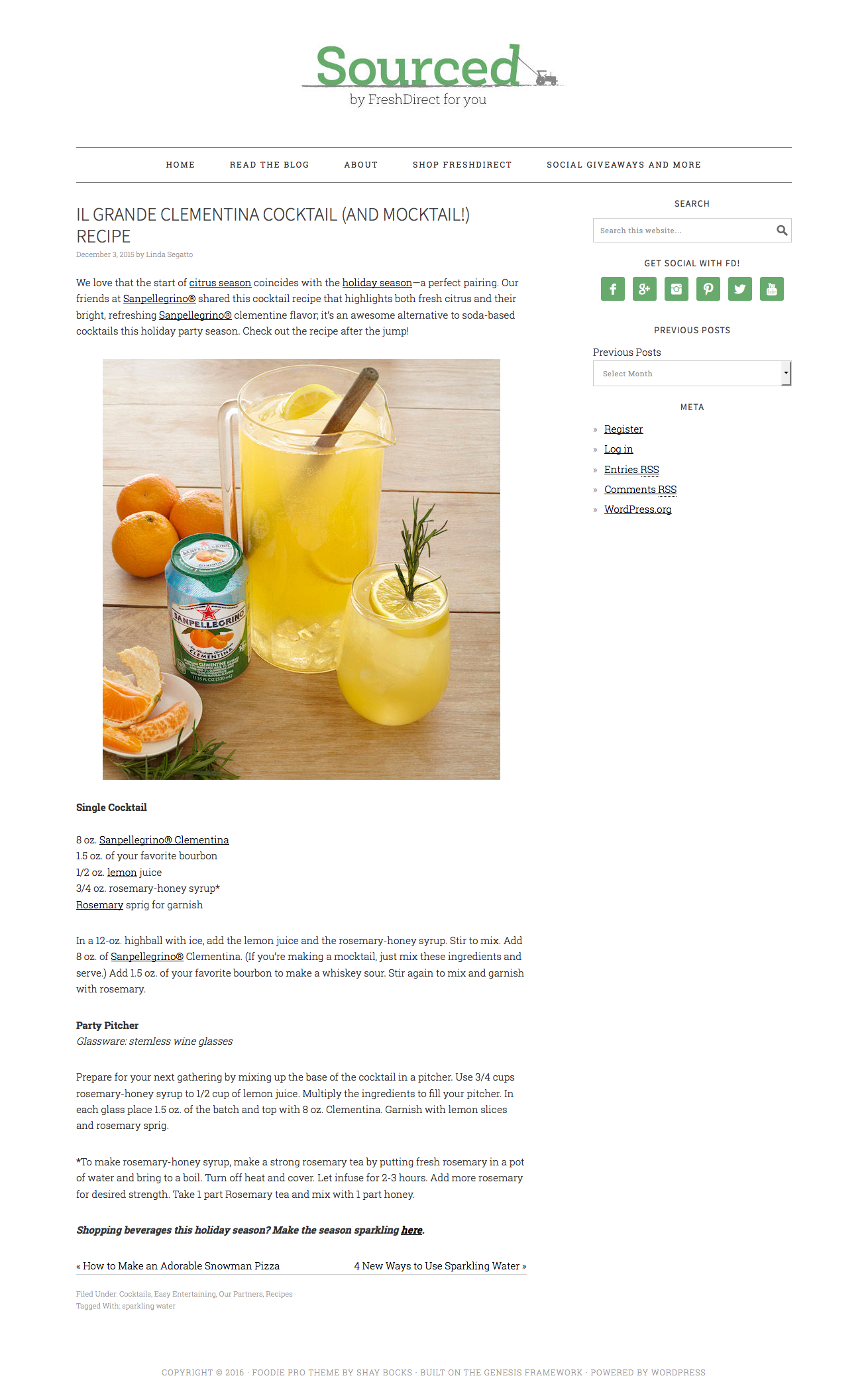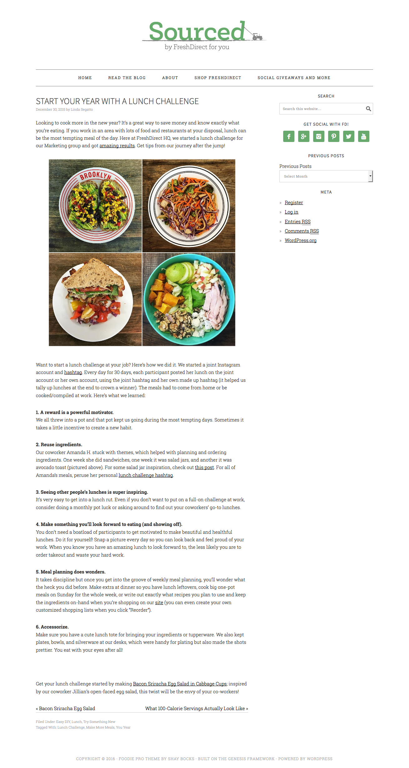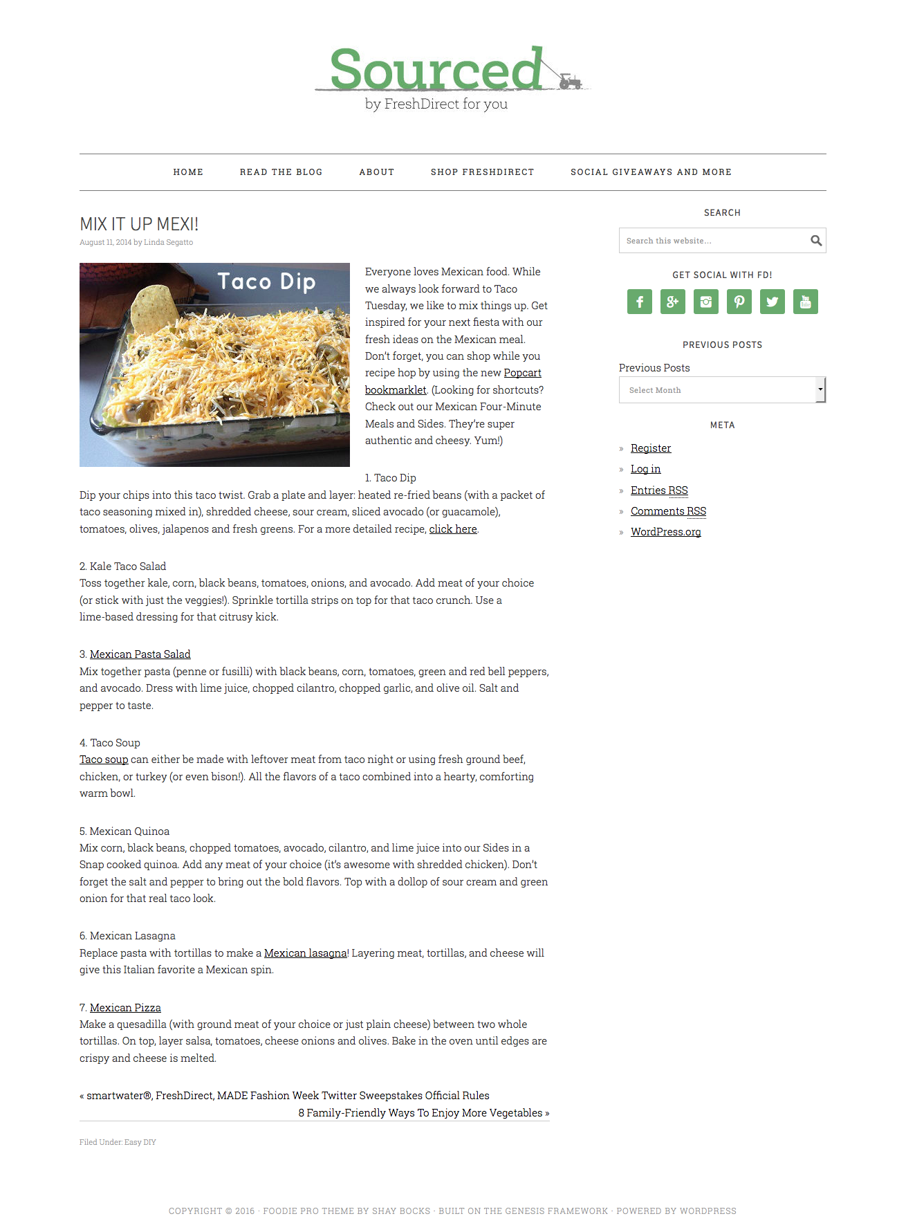 I named, helped design, and managed the blog and its integration and success in FreshDirect marketing by developing a content calendar with our photographers, social media manager, copywriter, and interns to coincide with promotions and tent poles. My authored blog content covered everything from highlighted promotions and integrated partnership content to tips, inspiration, and producer stories. (It’s still named Sourced 10 years later btw.)