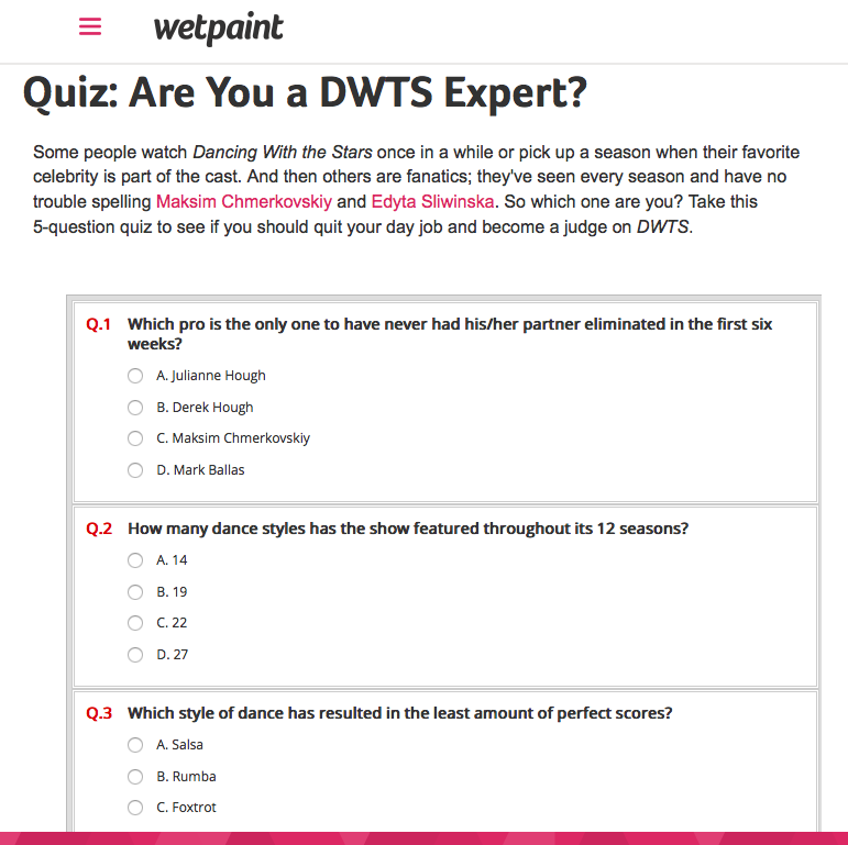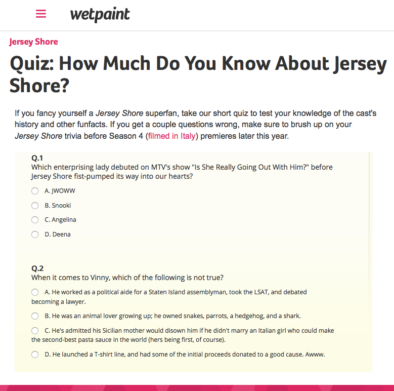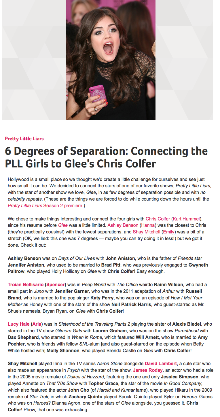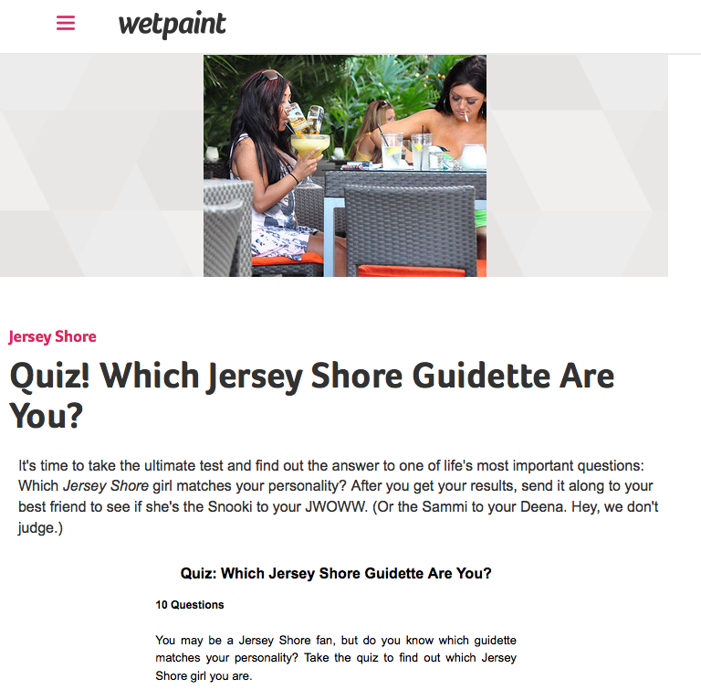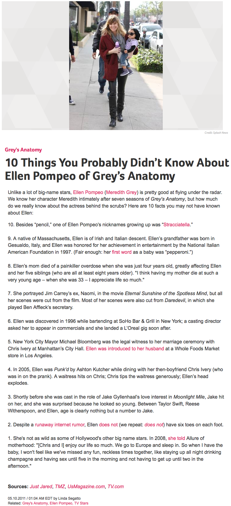 At Wetpaint.com I served as a contract editor, managing freelancers and internal copywriters and writing content to drive traffic. Our articles featured gossip and entertainment content around popular current TV shows (Jersey Shore, Pretty Little Liars, Dancing with the Stars) with a voice geared toward a young female audience.